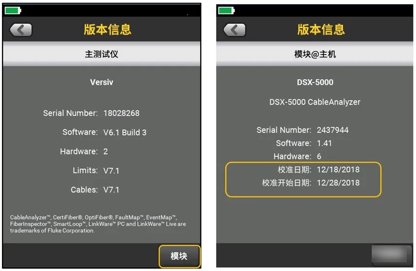 福禄克Versiv系列网络测试仪为保证模块工作在规定的精度指标范围之内,建议每12个月将其送至福禄克网络的授权服务中心校准一次。