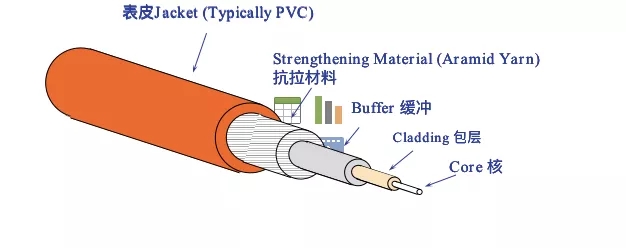 光纤是传光的纤维波导或光导纤维的简称。其典型结构是多层同轴圆柱体,如上图所示,自内向外为纤芯、包层和涂覆层。光纤的核心部分是纤芯和包层,其中纤芯由高度透明的材料制成, 是光波的主要传输通道;包层的折射率略小于纤芯,使光的传输性能相对稳定。纤芯粗细、纤芯的材料和包层材料的折射率,对光纤的特性起决定性影响。涂覆层包括一次涂覆、缓冲层和二次涂覆,保护光纤不受水汽的侵蚀和机械的擦伤, 同时又增加光纤的柔韧性, 起着延长光纤寿命的作用。